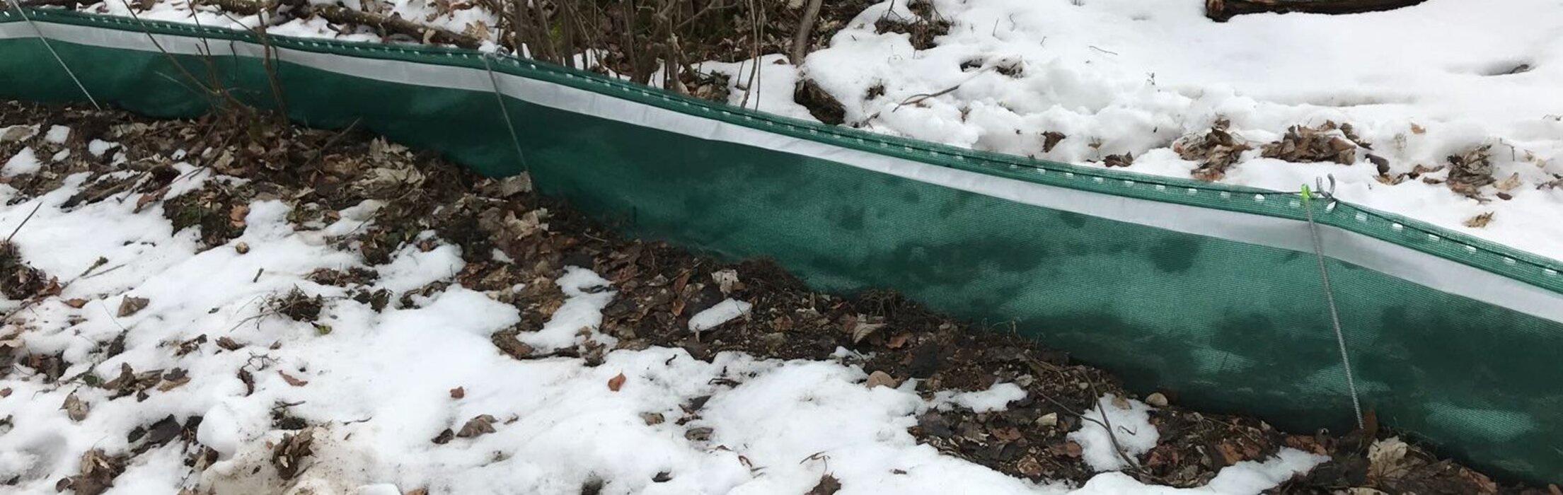 - Voraussetzung war ein leichtes Gewirke (Gewebe) mit maximaler Blickdichte, da die Amphibien versuchen würden, bei sichtbarem Hintergrund weiter in Richtung des Zauns zu wandern. Das Ziel war, die Amphibien entlang des Zauns in spezielle Sammelbehälter wandern zu lassen.